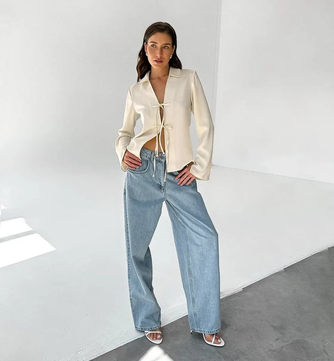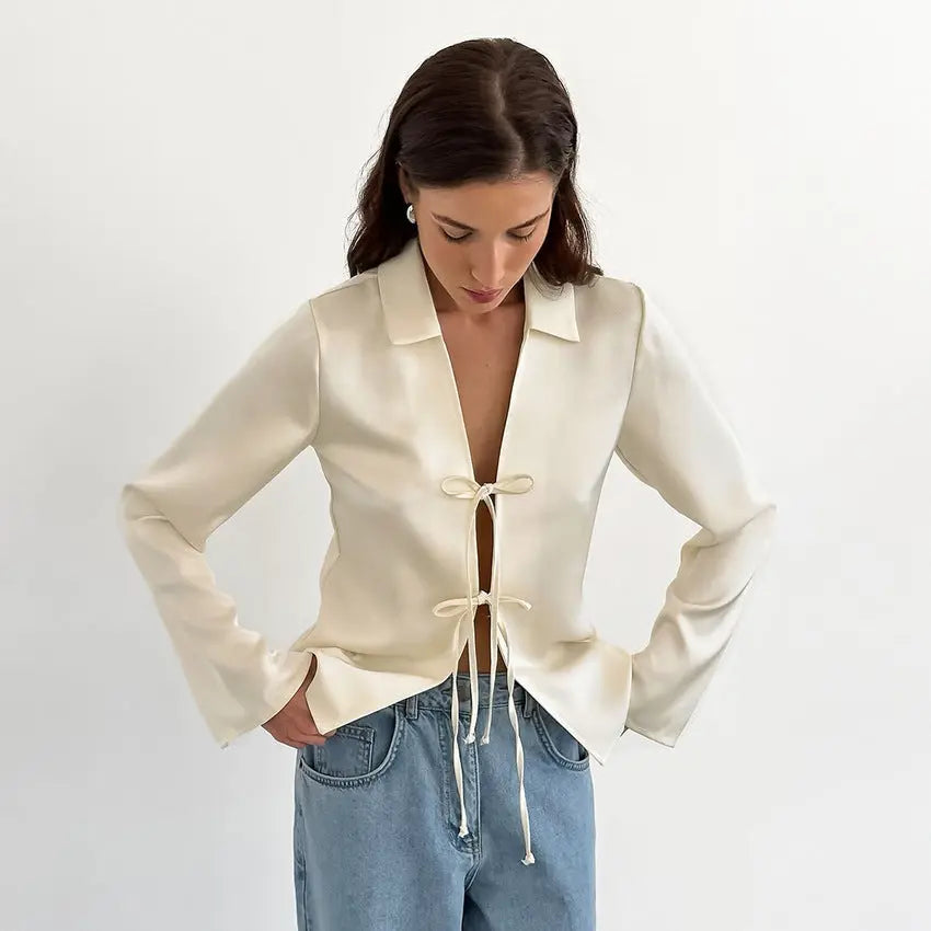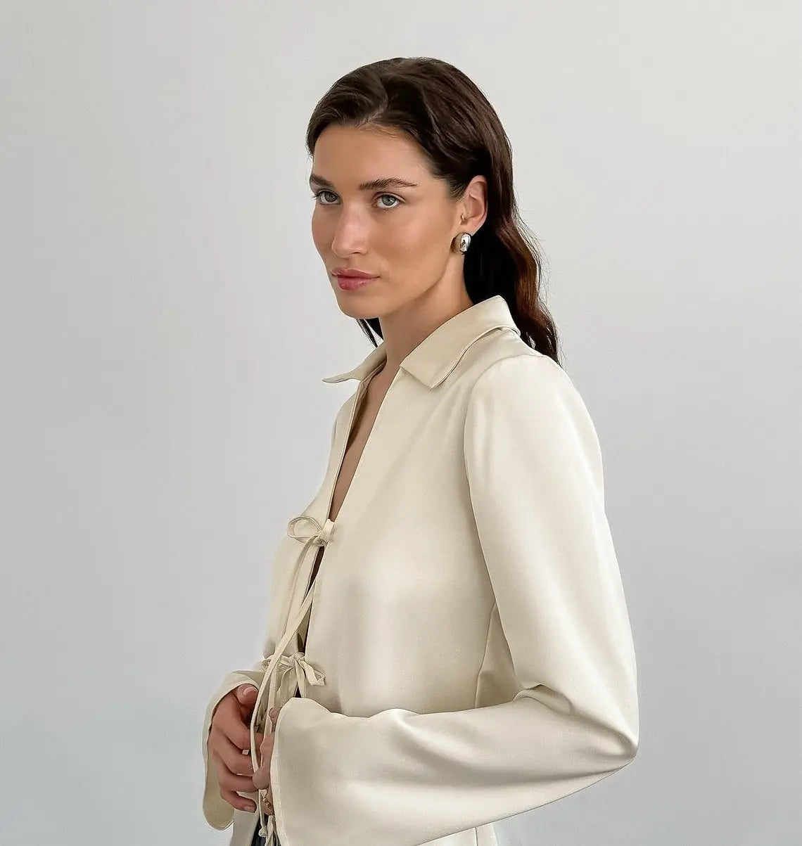 Shop now to add a refined touch to your collection. The Collar Front Bow Top is more than just a top—it's a fashion statement waiting to be made. Make elegance your signature style today!