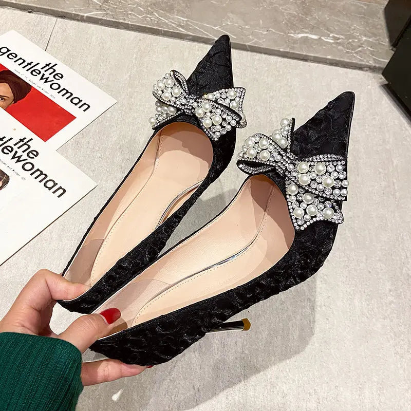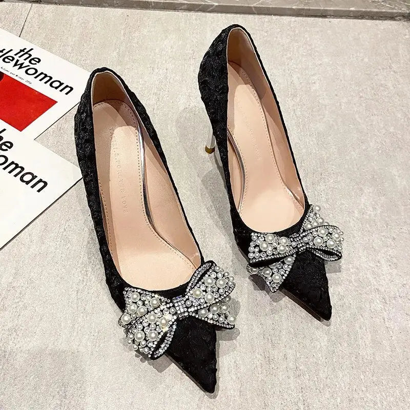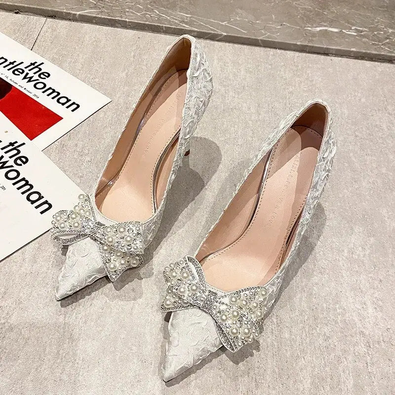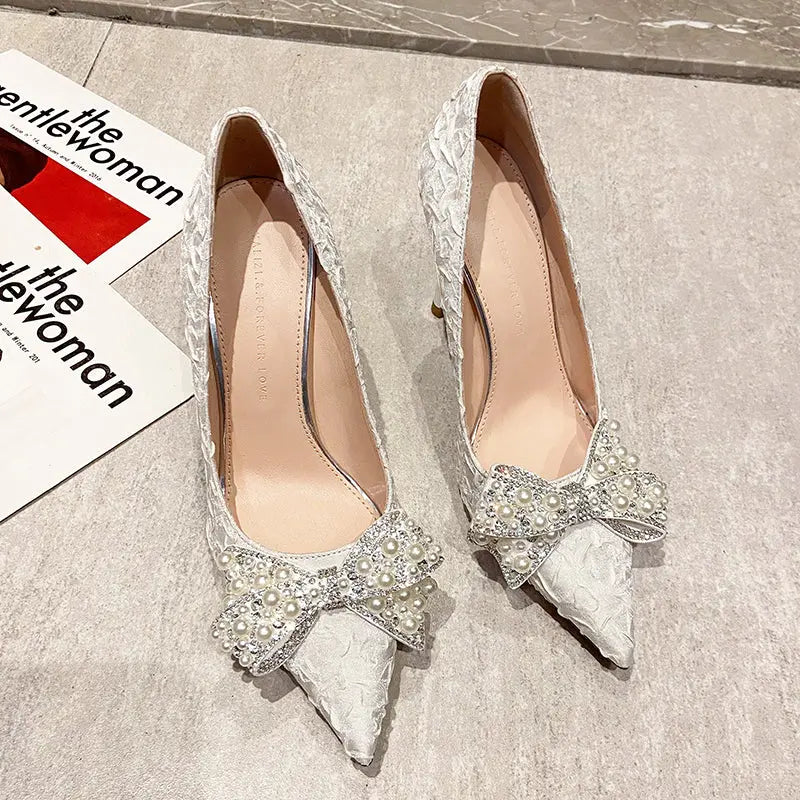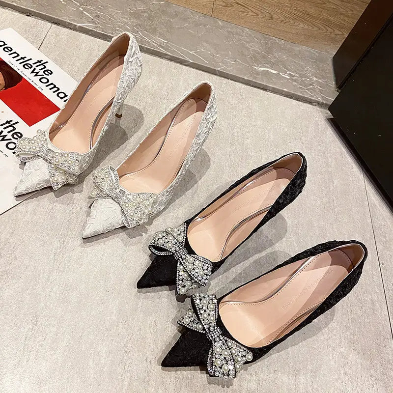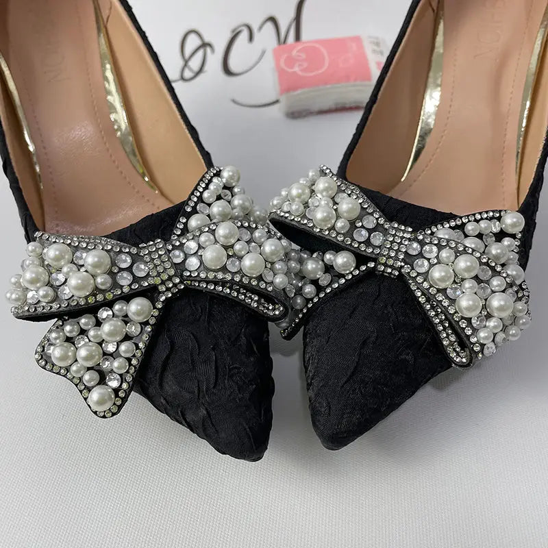 Elegant Pearl Diamond Bow Pointed Heels – Perfect for Glamorous Occasions