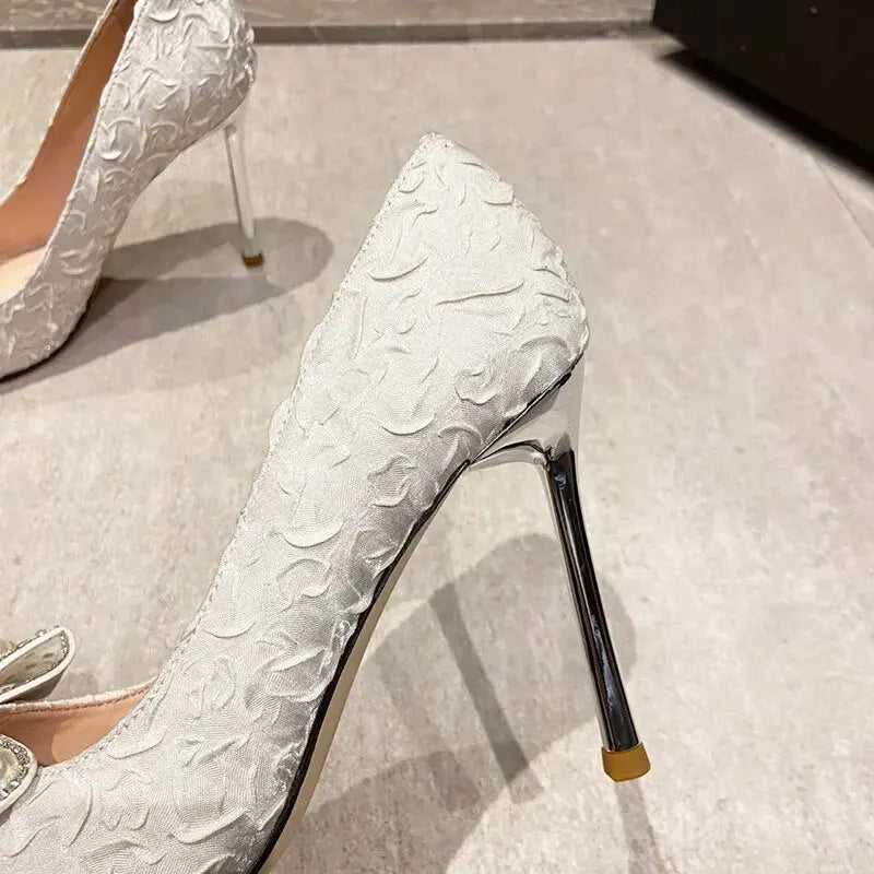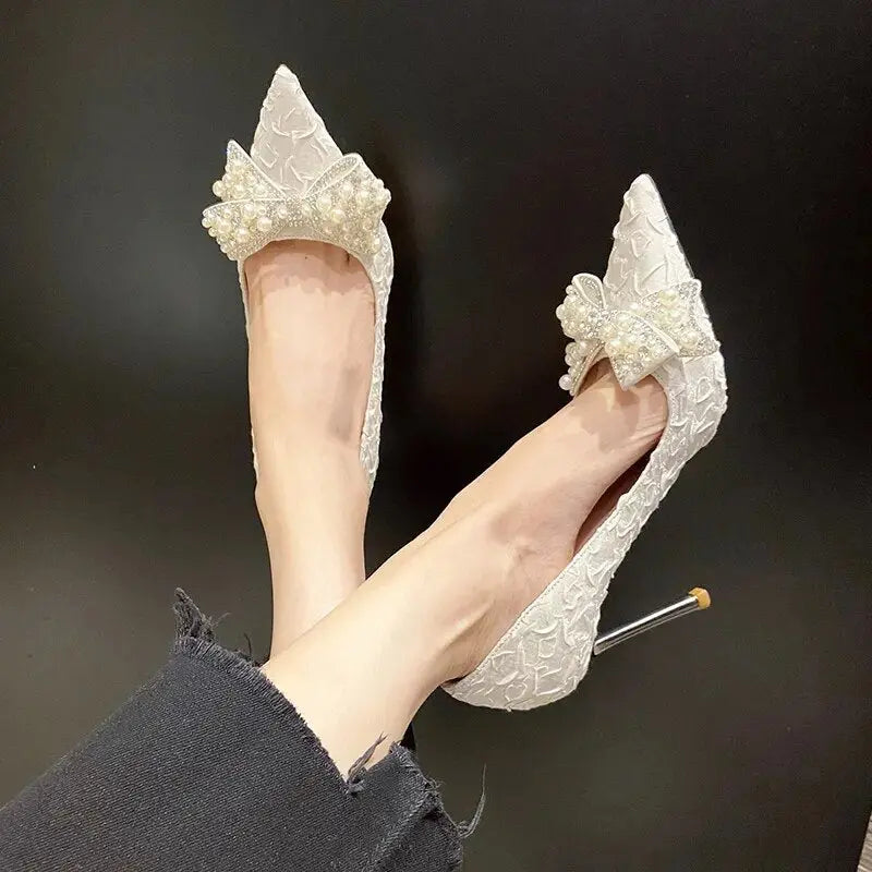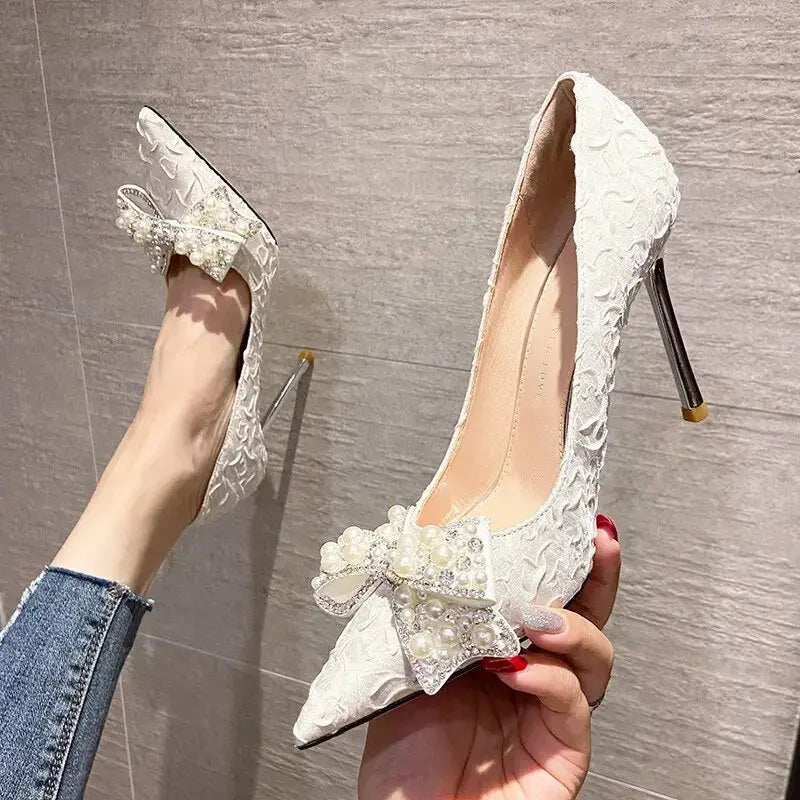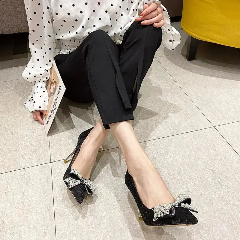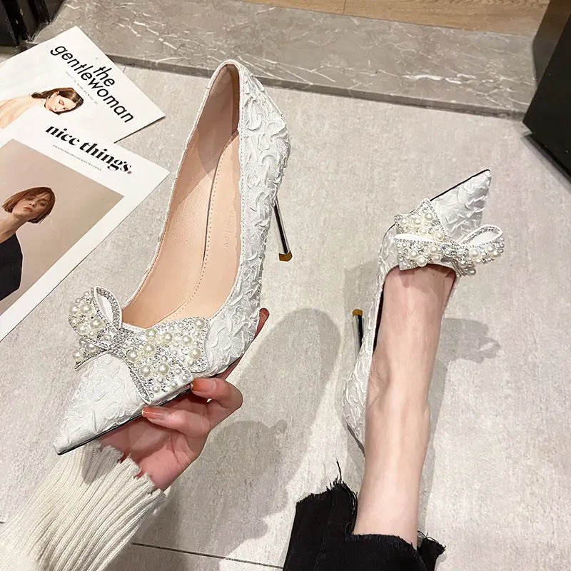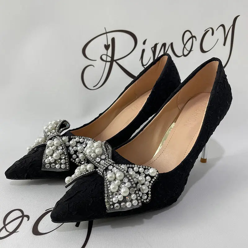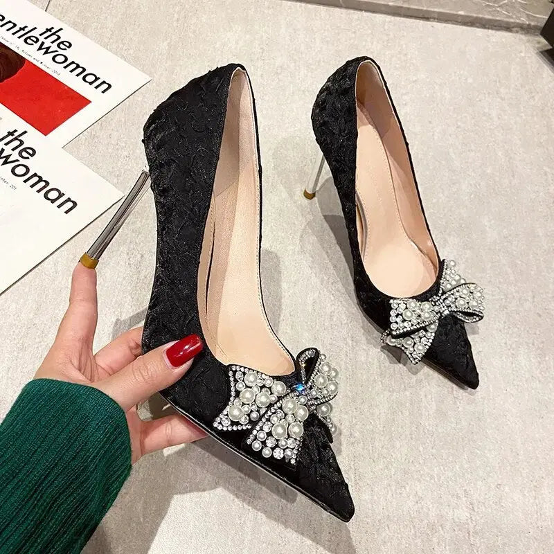 Elegant Pearl Diamond Bow Pointed Heels – Perfect for Glamorous Occasions